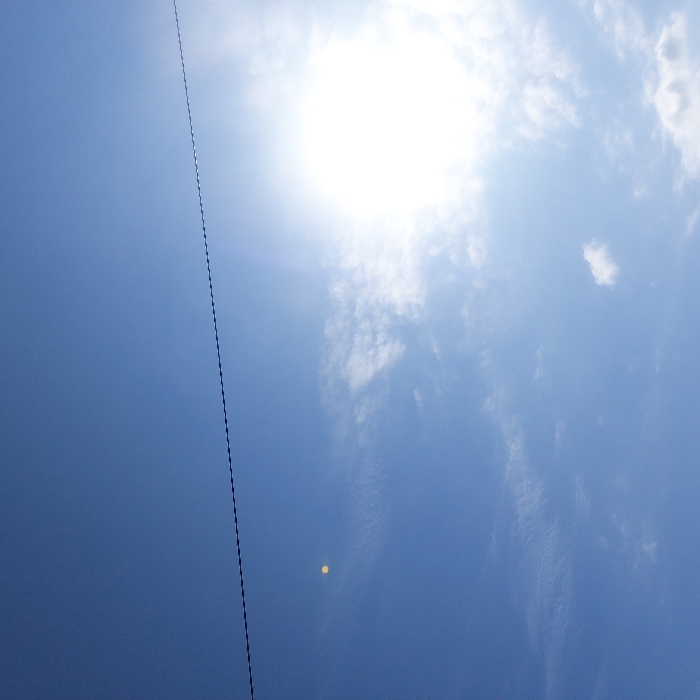 The scene, located in Gimpo-si, South Korea, captures an overhead view of a bright blue sky. A brilliant sun occupies the upper right quadrant, emitting significant glare and a broad white lens flare. Scattered, thin white clouds are present, primarily in the lower right and mid-left areas. A single dark, segmented wire spans horizontally across the mid-section of the sky. A distinct small, circular, yellowish-orange lens artifact is visible in the mid-left portion of the frame. No individuals, ground structures, or specific activities are depicted.
