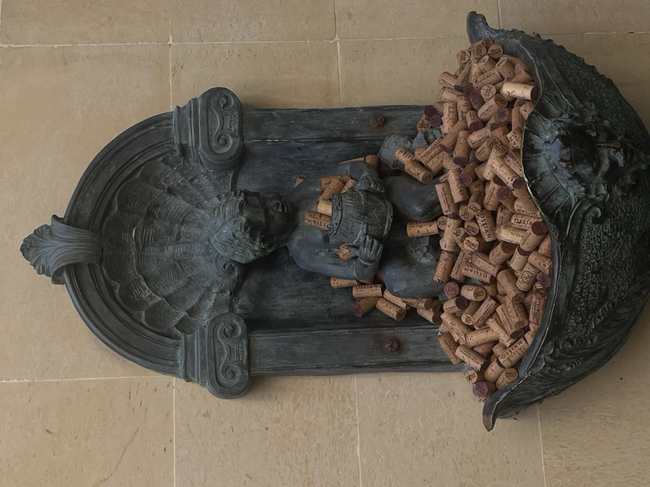 This image depicts a wall-mounted dark metal sculptural fountain feature located within the Mesón de Cándido (specifically often associated with its Bodega El Ojo section) in Segovia, Spain. The sculpture is set against a light-colored, cut stone block wall. The central subject is a patinated dark bronze or similar metal sculpture in the style of a classical wall fountain. It features an arched niche adorned with a scalloped shell design at its back, flanked by two pilasters with volute capitals. Seated within this niche is a nude, youthful figure, resembling a putto or cherub, holding a small barrel or cask in its lap. Below the figure, an ornate, shell-shaped basin extends forward, forming the lower part of the fountain structure. The basin and the area around the putto's legs are densely filled with a large accumulation of natural corks, primarily made of agglomerated cork. The putto's barrel is also overflowing with these corks. Many corks exhibit red staining on one end, consistent with having sealed red wine bottles. Visible markings on various corks include "OSSIAN," along with several vintage years such as "2023," "2022," "2021," and "2019," indicating their origin from wine production. The entire display is a static arrangement, with no visible water flow from the fountain.