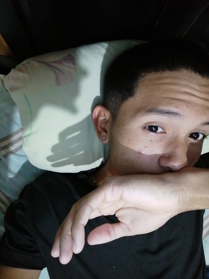 A young man with short dark hair rests on a pillow with a patterned cover. He wears a black t-shirt. His right hand is raised to cover his mouth and nose, casting a shadow on the pillow behind him. He has dark eyes and a fair complexion with a small stud earring in his left ear. The lighting is dim, creating a moody atmosphere.