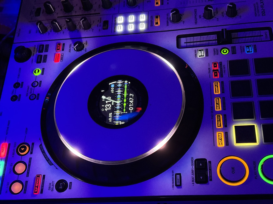 - "The scene depicts a close-up, angled view of a Pioneer DDJ-FLX6 DJ controller, illuminated predominantly by blue and purple ambient lighting in a low-light environment within the city of Sliven, Bulgaria" by FM-UqAa62, licensed under CC BY 4.0