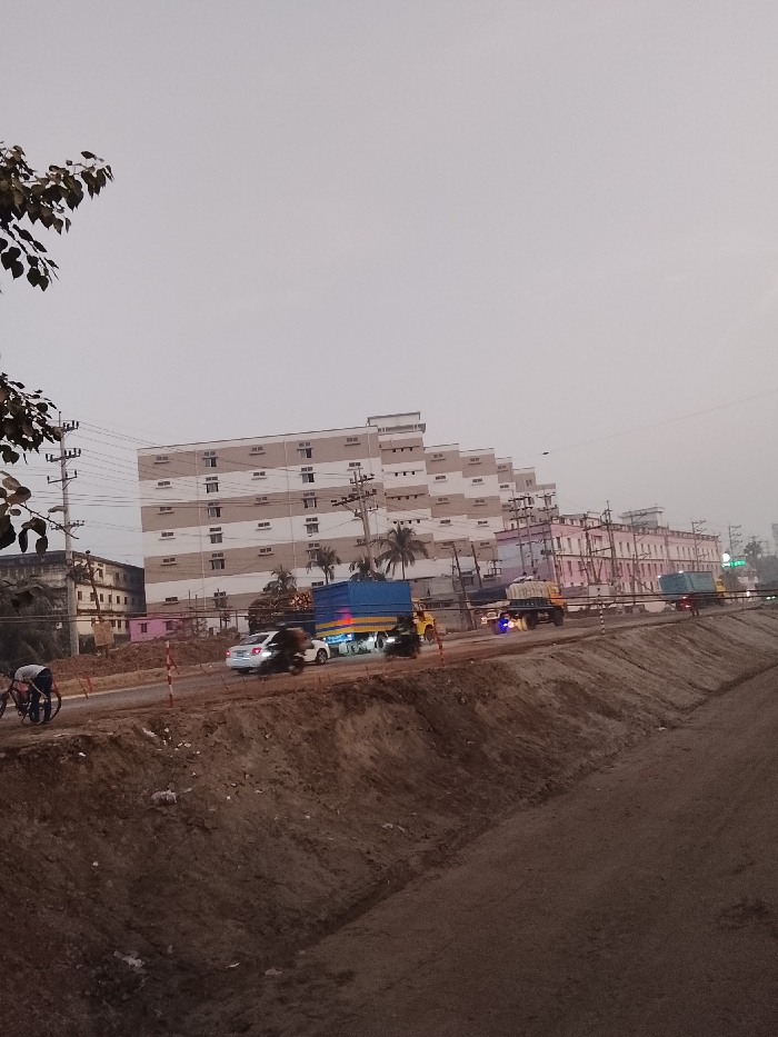 A cityscape view displays a series of modern apartment buildings striped with white and beige, alongside an older pink structure. Below, a roadway is bustling with a car, a scooter, and several large trucks, suggesting active transport. Adjacent to the road is a dirt embankment, possibly indicating ongoing construction or landscape modification. A tree branch is visible on the left. Overcast skies provide soft, diffused lighting for the scene.
