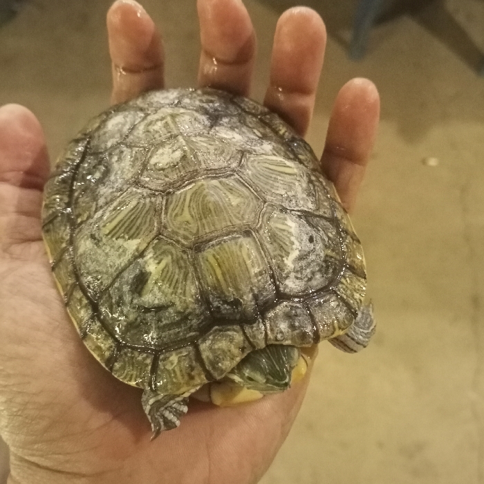 - "A small, live aquatic turtle, consistent with a Red-eared Slider, is held by a human left hand, palm up" by FM-cHJi83, licensed under CC BY 4.0