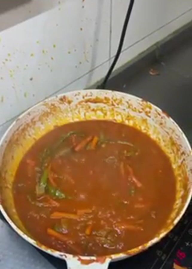 white frying pan on a black induction cooktop, containing a bubbling red sauce with visible green pepper slices and carrot sticks
