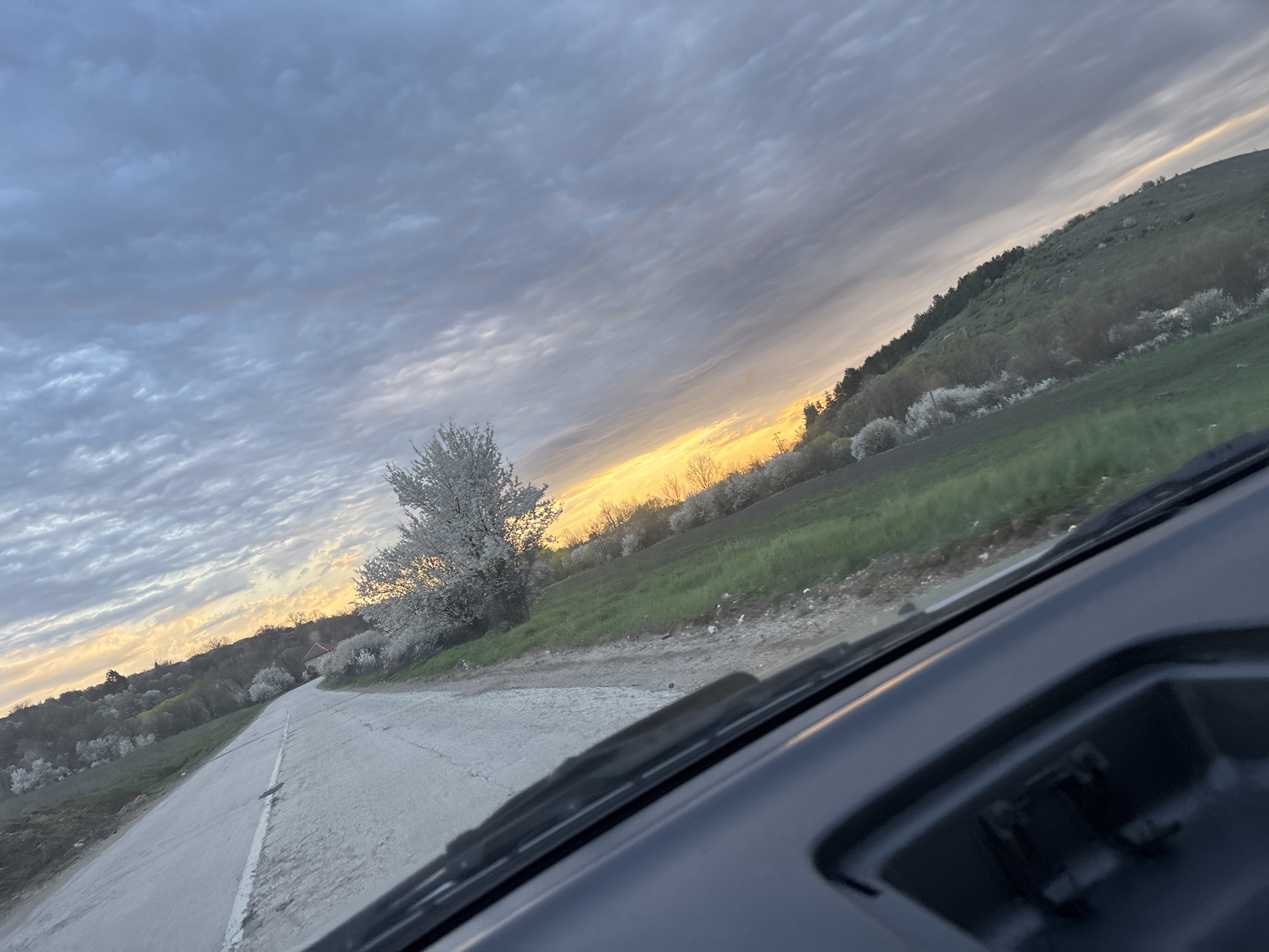 view from inside a car, likely driving on a road in the vicinity of Lepitsa, Bulgaria. The sky is overcast with striated clouds and a band of orange light indicating either sunrise or sunset on the horizon. A paved road stretches ahead, with a white line marking the edge. The landscape features trees with white blossoms on either side of the road. To the right, a green field leads up to a hillside covered in trees. The dashboard of the car is visible in the foreground, including the windshield wipers. No people are visible.