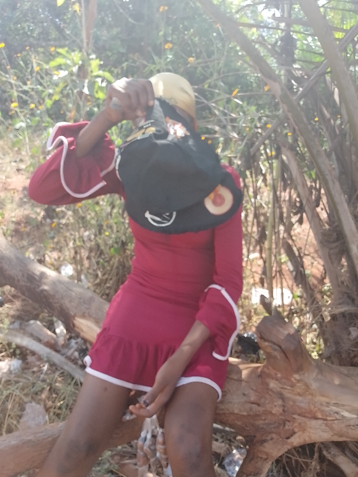An individual is depicted outdoors in Ejule, Nigeria, positioned on a large, fallen tree trunk or branch. The person, viewed from a slightly elevated angle and from the rear-left, wears a dark red, short-sleeved dress featuring white trim on the flared sleeves and ruffled hemline. A light-colored head covering is visible beneath a black baseball cap, which the individual holds aloft with their right hand, obscuring the upper rear portion of their head. A ring is visible on the right hand. The left arm rests on the person's thigh. The immediate ground cover consists of reddish-brown earth, sparse green vegetation, and scattered white plastic debris. The background features dense green foliage, numerous thin tree trunks, and small yellow flowers, illuminated by bright daylight.