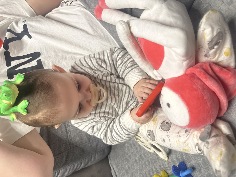 A baby with a pacifier lies on a couch. A green toy frog is perched on their head. The baby wears a striped shirt and holds a red object. A large white and red bunny stuffed animal is next to the baby. A person in a white shirt is next to the baby. A white blanket with animal prints is under the bunny. Colorful toys sit at the bottom of the frame. The couch is gray.
