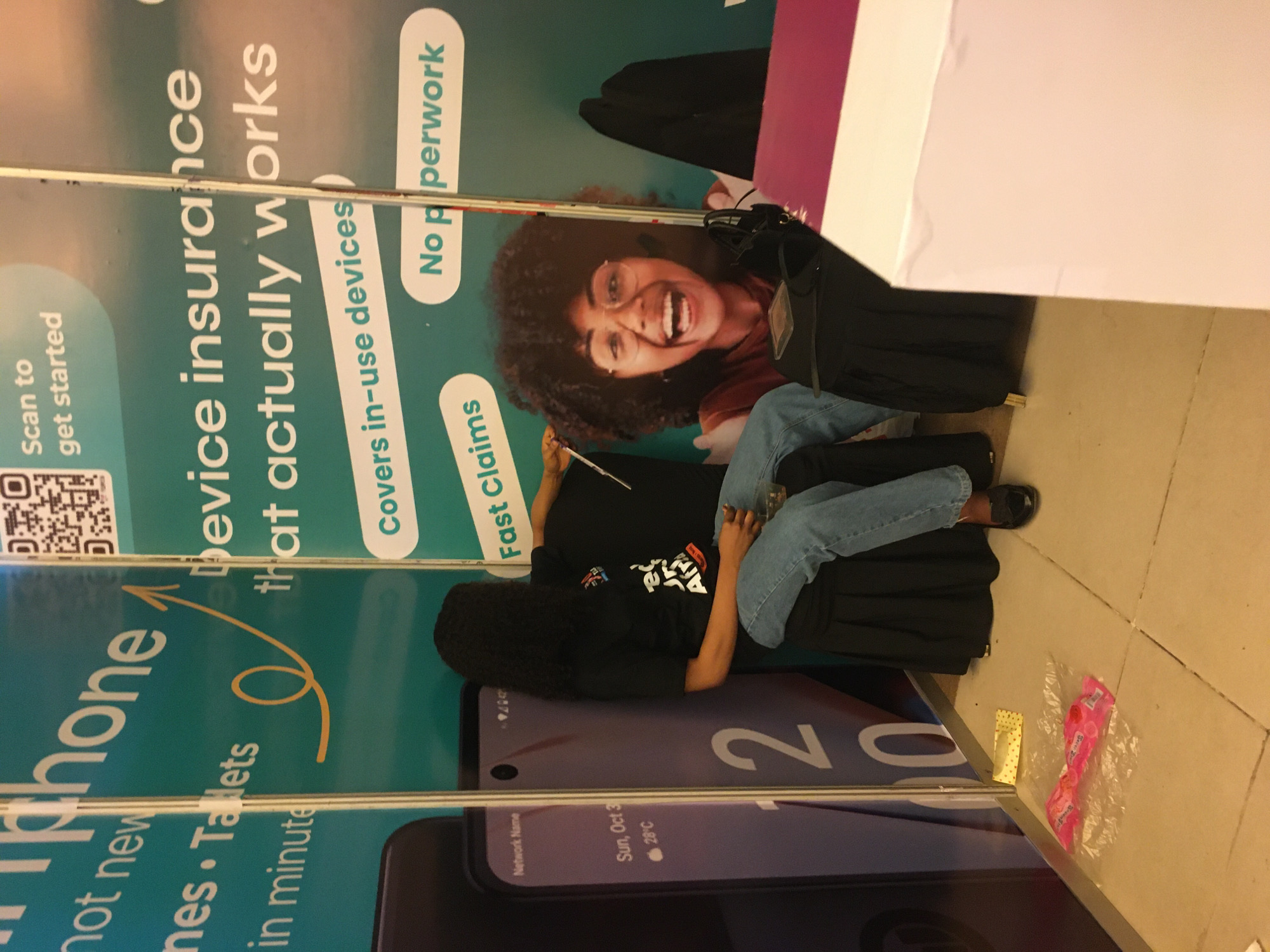 In Itirin, Nigeria, an interior scene depicts a person seated within a temporary booth structure. The individual, dressed in a black t-shirt with white lettering, blue jeans, and black flat shoes, has long, dark, curly hair obscuring their face. They are seated on a black, fabric-draped stool, holding a small, clear container in their left hand and a thin object in their right hand, extending it towards a booth wall. The booth walls consist of teal-colored banners. The left banner features partial text "phone," "not new," and "Tallets," alongside a graphic of a smartphone displaying "Sun, Oct 3" and "28°C." The right banner advertises "device insurance that actually works," highlighting "Covers in-use devices," "No paperwork," and "Fast Claims." A QR code labeled "Scan to get started" is visible at the top right, accompanied by a large image of a smiling woman with curly hair and glasses. An orange arrow graphic is present on the left banner. On the tiled floor, two pieces of discarded packaging are visible: one yellow with white polka dots, and another clear plastic wrapper with pink graphics. A second black, fabric-draped stool is positioned to the right of the seated individual, with a black bag placed in front of it. A white and maroon display counter or stand is partially visible on the far right. Metal framing elements indicate the modular construction of the booth.