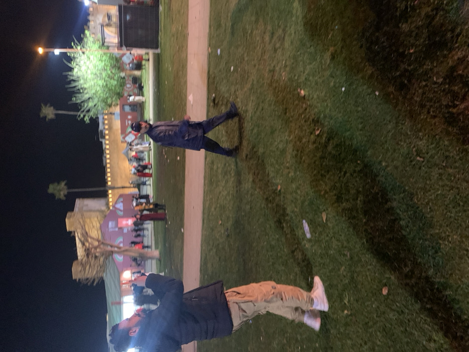 Two men stand on a grassy area at night. One wears a black jacket and tan pants, seemingly holding a camera. The other wears a blue jacket and dark pants. They are in a park-like setting with buildings in the background. A lit-up building and streetlights are visible in the background behind them. There are some other people at the background.