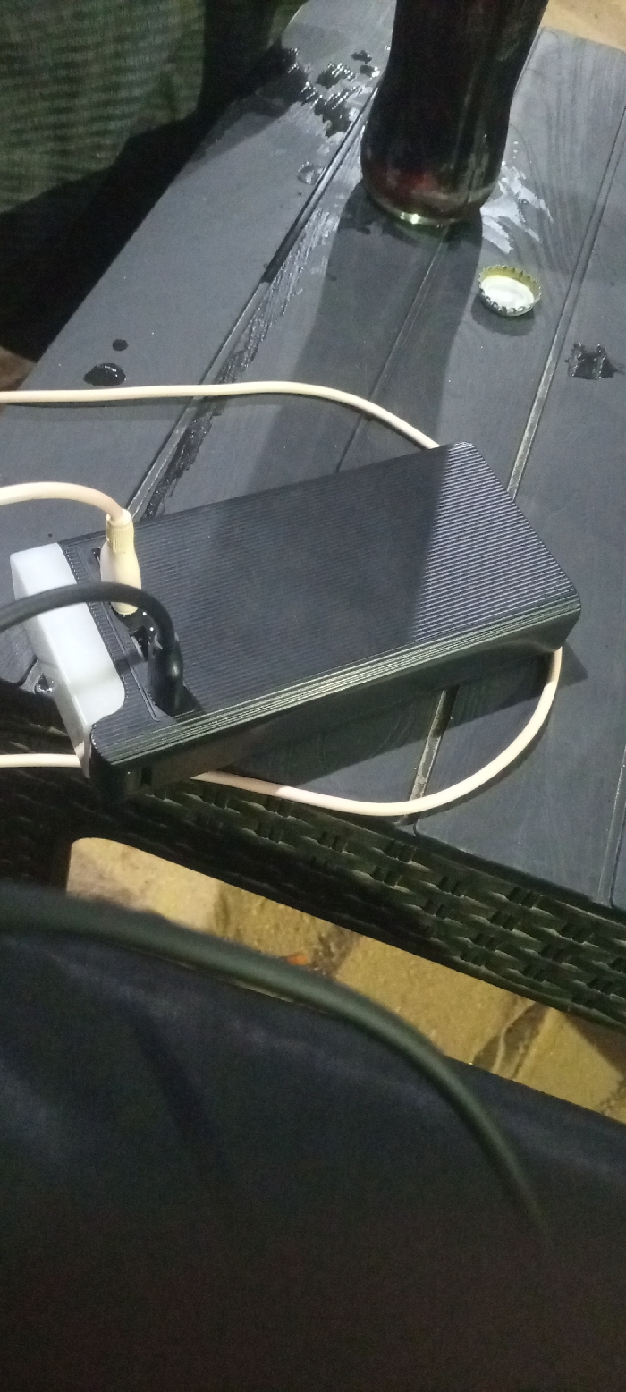 A black, rectangular power bank sits on a weathered gray table. Two cables are connected to the power bank: one is white and the other is black. A white charging block is attached to the white cable. Beside the power bank are a glass bottle with a dark liquid and a silver bottle cap. The table is wet and has visible droplets. A blurry image of someone's clothes appears in the lower portion of the image.