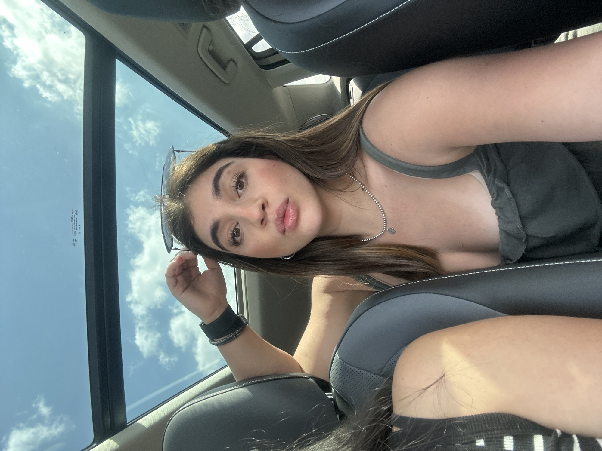 A woman is taking a selfie inside a car with a sunroof open to a bright sky with scattered clouds. She is wearing a gray tank top and a necklace, and has sunglasses perched on her head. She's holding her glasses with one hand and looking at the camera. She's wearing a dark bracelet on her left wrist. The car's interior features black leather seats with white stitching. The location appears to be Mexico City, Mexico, based on the Spanish safety label on the window.