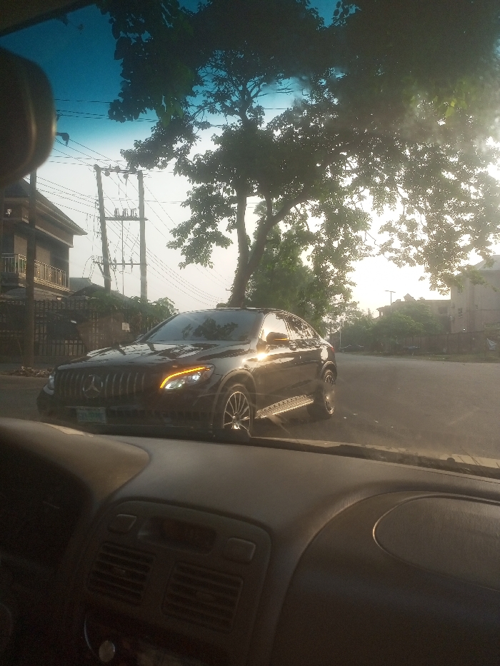 A black Mercedes-Benz SUV with chrome accents, seen through the windshield of another car. The SUV is positioned on the left side of the road, its headlights illuminated. A large tree partially obscures the background sky. Electrical poles are visible in the distance on the left, alongside a building with a balcony. The car's dashboard is partially visible at the bottom of the frame.