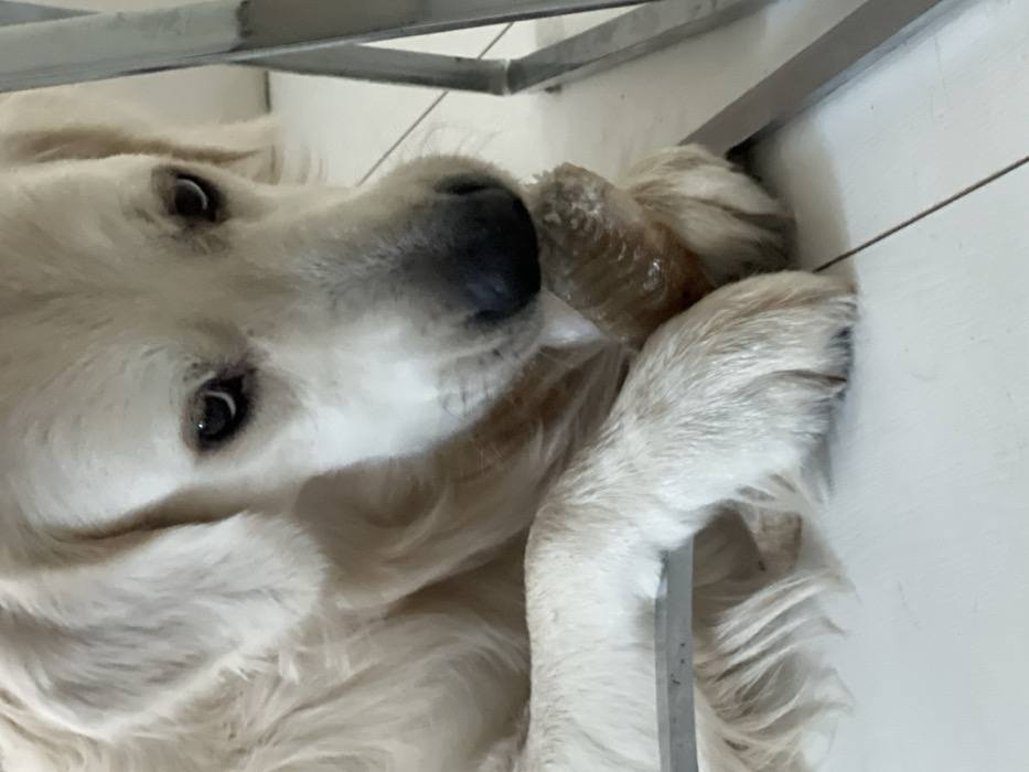 A cream-colored Golden Retriever dog is observed indoors in Izhevsk, Russia. The dog is positioned low to the ground, its head angled downwards, actively gnawing on a light brown, ridged chew object held between its mouth and front paws. Its dark eyes are partially visible, directed slightly upward. A metallic, light-colored horizontal bar is visible beneath the dog's left forepaw, and a vertical metallic leg is partially visible on the right. The floor is comprised of light-colored, possibly white, tiles or planks with visible seams. The scene is illuminated by ambient indoor light.