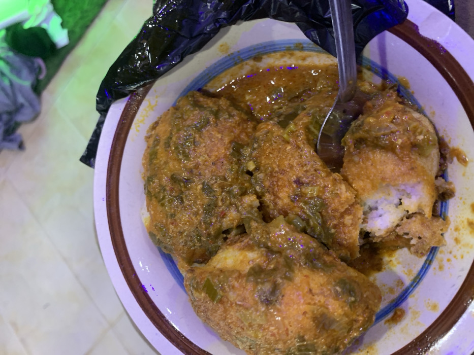 The image presents a close-up view of a meal served in a round ceramic plate. The plate has a white interior with blue striped accents on its rim and a broader brown outer rim. Inside, several portions of a white, dense, starchy food (consistent with a Nigerian 'swallow' such as Fufu or Pounded Yam) are visible, heavily coated in a thick, orange-brown stew. The stew contains discernible green leafy vegetables and reddish particulate matter, suggesting spices or peppers. A metallic spoon is partially inserted into the meal, indicating active consumption. To the right of the plate, a crumpled black plastic bag is positioned. The background is out of focus, revealing a light-colored tiled floor or surface directly beneath the plate, and indistinct shapes with prominent green and purplish ambient lighting, suggesting an indoor environment. The specific location within Jos, Nigeria, cannot be determined from the visual evidence.
