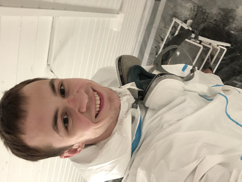 A young adult male is depicted in an indoor environment, consistent with a work or renovation space in Starokorsunskaya, Russia. The man, with short brown hair and a light complexion, looks directly at the camera, exhibiting a broad smile. A small red mark is visible on the bridge of his nose. He is wearing a white disposable coverall, possibly a hazmat suit, featuring light blue trim details. A grey respirator with two white circular filter cartridges and a pair of clear safety goggles are positioned around his neck. The background consists of white horizontally paneled walls. The floor is dark, likely concrete, and visibly covered with a fine layer of white dust or debris. To the lower right, a multi-tiered metal rack, possibly a drying rack or shelving unit, is visible, also coated in white dust.