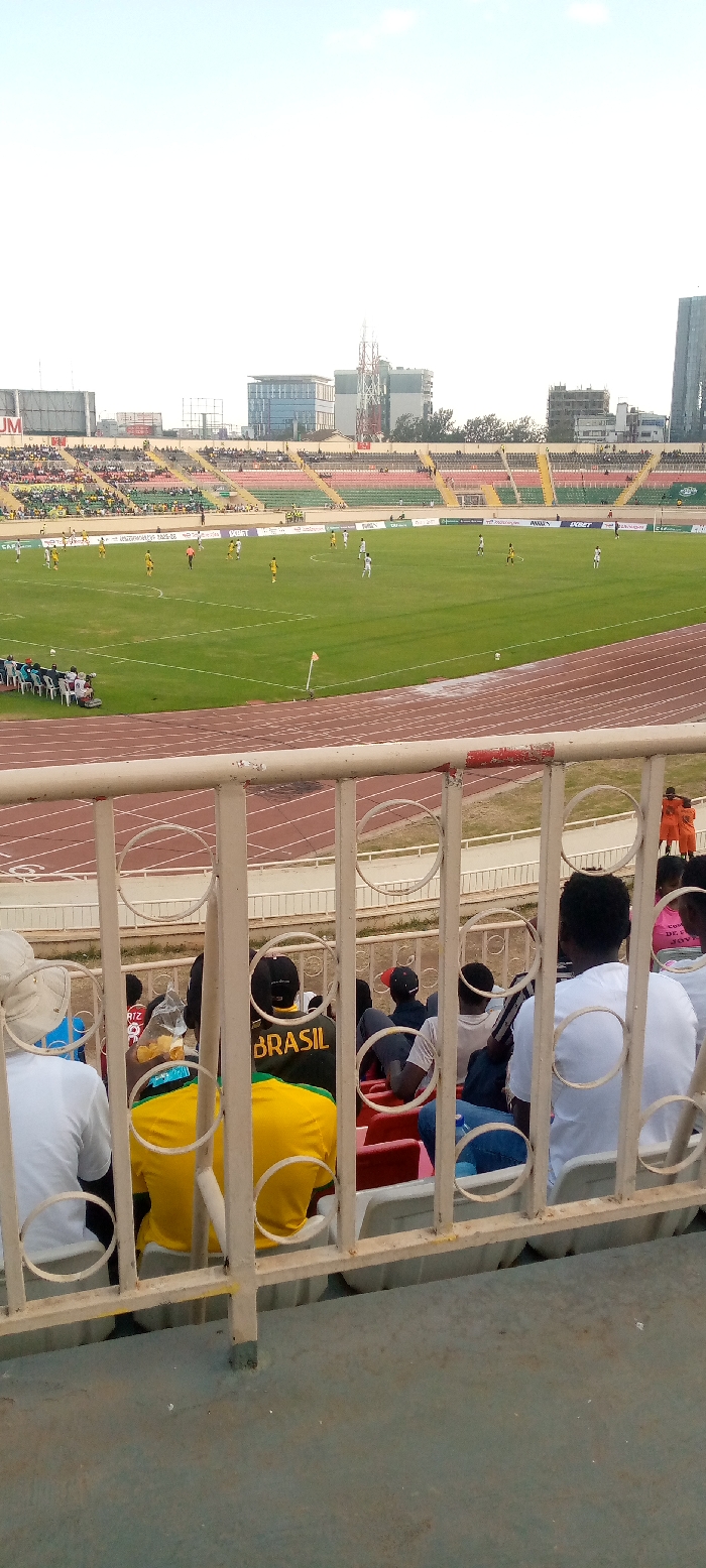 From behind a stadium railing, a soccer game unfolds on a green field surrounded by stands filled with spectators