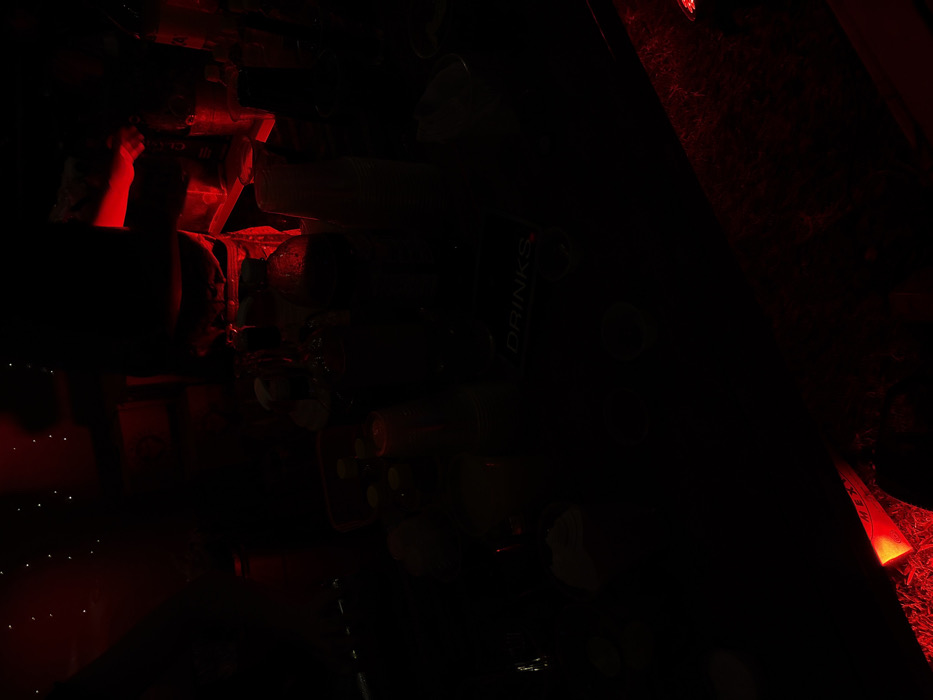 A dark, blurry image with red lighting. A raised arm is visible to the left. A container labeled "DRINKS" is partially visible. Some objects, possibly cups or bottles, are clustered together. A bright red light is present at the lower right corner. The rest of the image is obscured in darkness.