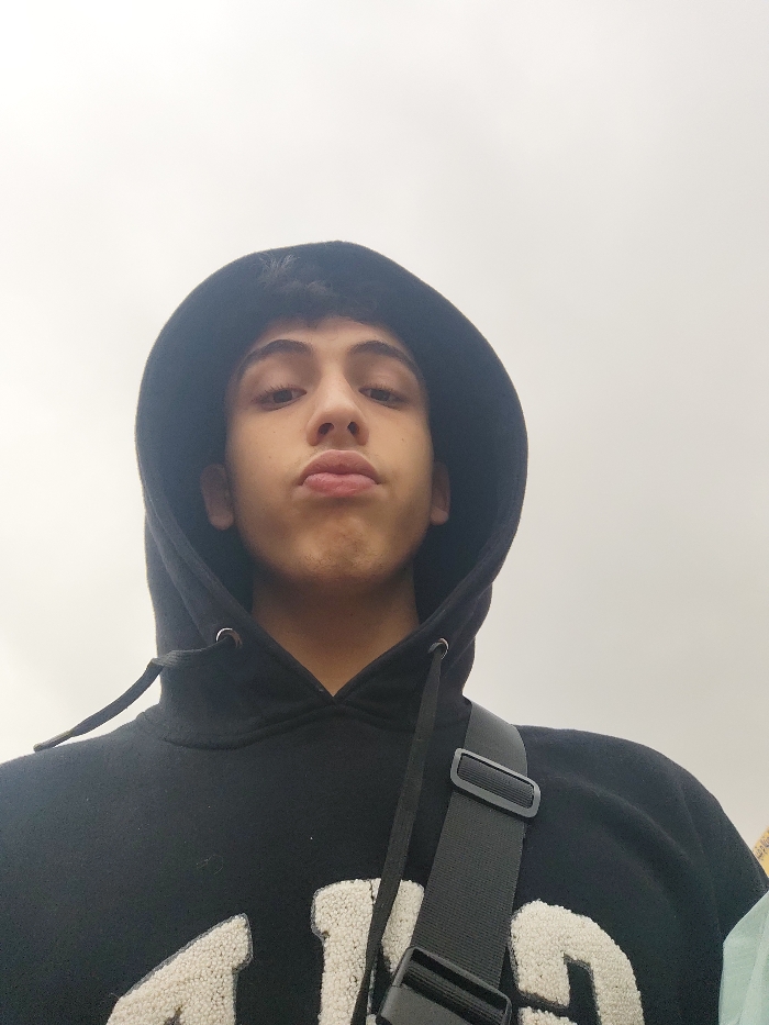 - "An upward-angled portrait depicts a young male subject with fair skin and dark, short, curly hair, wearing a black hooded sweatshirt with the hood pulled up" by FM-BskwX2, licensed under CC BY 4.0