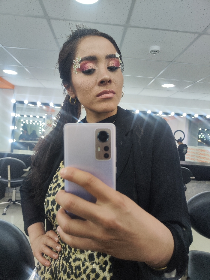 A woman in a leopard-print top and a black blazer takes a selfie with a lavender smartphone. She is in a room with salon chairs and a large mirror with lights. She has light skin, dark hair pulled back, and gold hoop earrings. Her eye makeup is a blend of pinks and golds, adorned with small white flower-like embellishments near her temples. Her lips are a neutral pink.