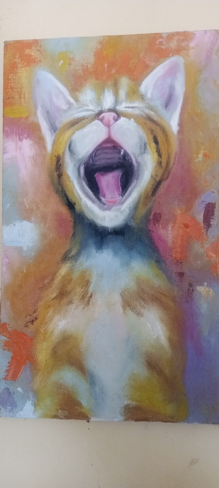 - "This image depicts a vertical format painting of a cat's head and upper chest, prominently displaying the cat mid-yawn" by FM-9JAB42, licensed under CC BY 4.0