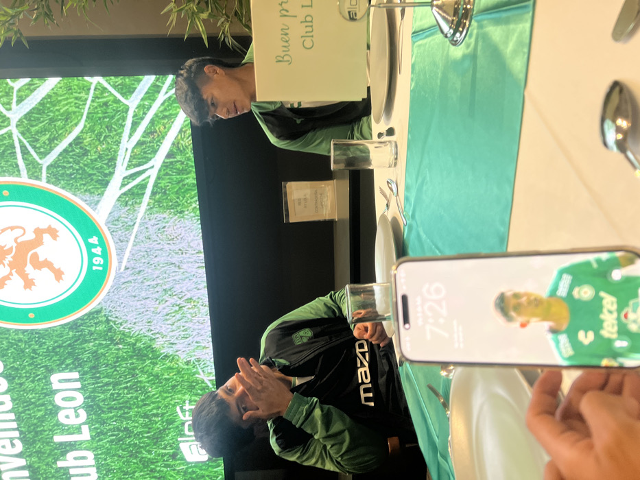 A meeting appears to be taking place. Two men are sitting at a table with place settings. One man looks surprised with hands clasped at his face; he wears a jacket with the word "Mazda". A phone displays the time as 7:26 AM with an image of a player in a green soccer jersey. A large screen behind them displays the logo of Club Leon and a green grassy background.