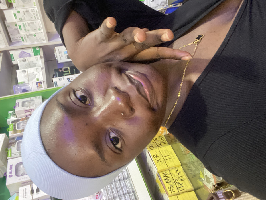 A dark-skinned individual, located in a retail establishment in Kaduna South, Nigeria, is depicted in a close-up portrait, facing the camera. The individual wears a light blue ribbed head covering and a dark, possibly black, ribbed top. A small silver stud is visible on the left nostril. A thin gold-colored chain necklace, featuring a small black clover-shaped pendant, is worn around the neck. The individual's eyes are open and directed forward, with a slight upturn at the corners of the mouth, indicating a subtle smile. The right hand is raised to the right side of the head, fingers slightly splayed and bent. A thin band-style ring is present on the fourth finger of the right hand. The background reveals shelving units stocked with various boxed electronic accessories, including items labeled "URA HOUSE," "USB CABLE," and "USB PD ADAPTER." Yellow labels on a lower display surface identify mobile phone models such as "XS MAX," "XR," "11 pro Max," "12 pro max," "13," and "14." The scene is illuminated by artificial light, with a discernible purple hue cast over the upper facial area.