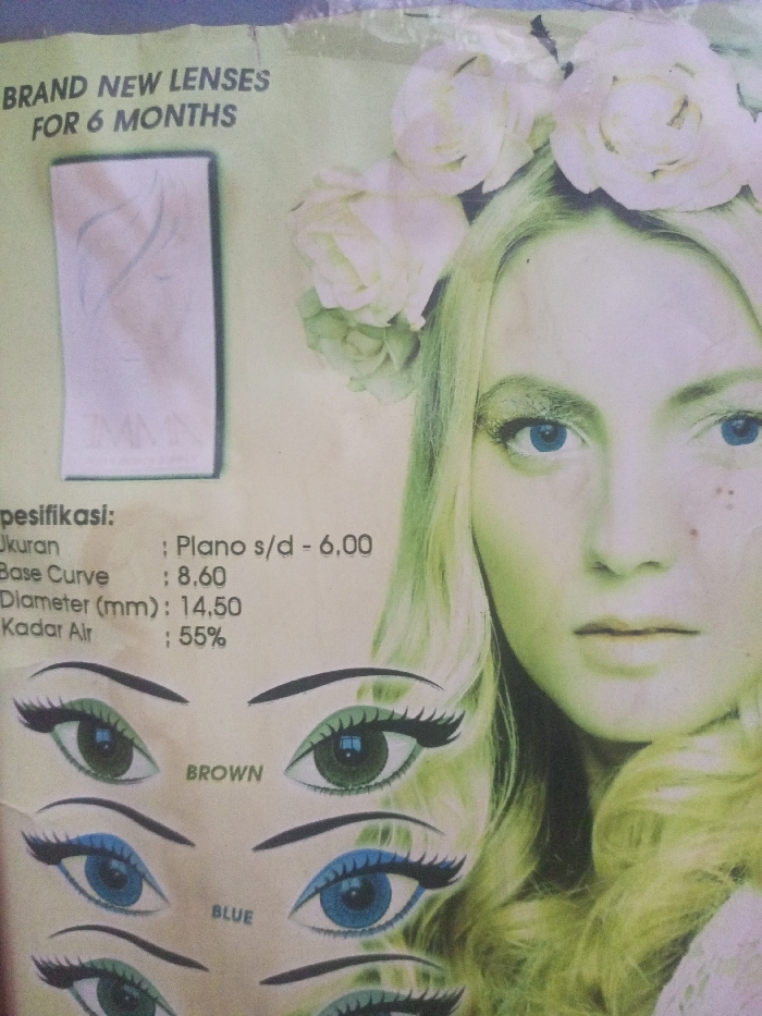 This image depicts a weathered commercial advertisement for contact lenses, located in Zee Pin Kone, Myanmar. The advertisement features a light green background. On the right, the upper portion of a blonde female model's face is visible, adorned with a wreath of white flowers. Her eyes display blue contact lenses, complemented by green eyeshadow. The top left corner of the advertisement reads "BRAND NEW LENSES FOR 6 MONTHS" in English. Below this, a small, light-colored rectangular product package is shown. Further details are listed in Indonesian/Malay: "Ukuran: Plano s/d - 6.00", "Base Curve: 8.60", "Diameter (mm): 14.50", and "Kadar Air: 55%". The lower left section presents stylized illustrations of eyes with contact lenses in "BROWN" and "BLUE" colors, with a third color partially visible at the bottom. The advertisement exhibits creasing and wear along its top edge.