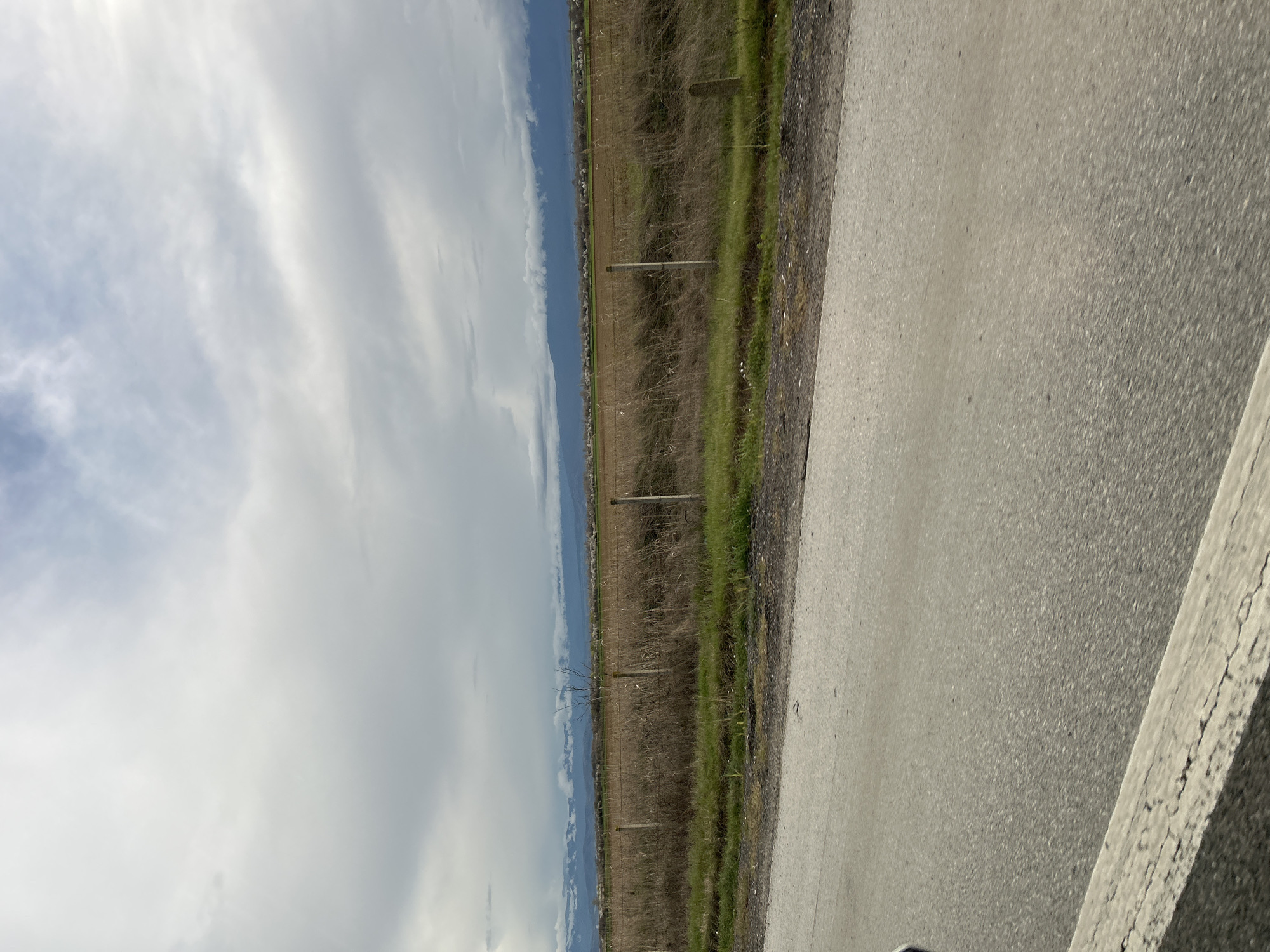 The scene, captured from an asphalt road in the vicinity of Shtarkovo, Bulgaria, depicts a rural landscape under an overcast, heavily clouded sky. The foreground shows a gray asphalt road surface with a visible, cracked concrete curb along the lower left edge, suggesting the perspective is from a vehicle. Immediately adjacent to the road, a strip of green grass and weeds transitions into a wide, flat field dominated by dry, brown vegetation resembling tall grasses or crop stalks. A fence line runs horizontally through this field, composed of several evenly spaced, light-colored posts and multiple horizontal strands of wire. In the mid-distance, beyond the brown field, a distinct band of white or light-pink blossoms, likely from trees such as almonds or cherries, suggests the presence of orchards or a settlement. The far background features a range of mountains, partially obscured by low-lying clouds that cling to and cover parts of their peaks. No individuals, animals, or specific actions are discernible within the frame.