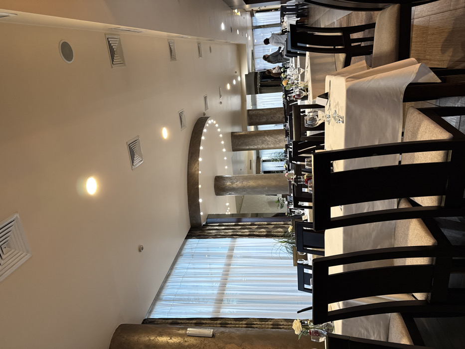 This is an interior photograph of a commercial dining establishment in Unknown, Unknown. The scene depicts a well-lit restaurant hall with numerous rectangular tables, each uniformly draped in a white tablecloth and set with glassware (wine and water glasses) and silverware. Dark-stained wooden chairs with light-colored upholstered seats are positioned around the tables. The ceiling is white, featuring multiple square HVAC vents and circular recessed spotlights. A prominent architectural element consists of a semi-circular bulkhead with embedded circular lights, supported by large, textured cylindrical columns finished in a metallic tone. Natural light filters in from a wall of windows covered by sheer white curtains and dark side drapes. In the distant background, three individuals are present: one wears a light-colored top and dark trousers, while two others are partially obscured, standing near tables. No explicit interactions or specific actions beyond standing are discernible among the individuals. A white rose in a vase serves as a centerpiece on one of the foreground tables.