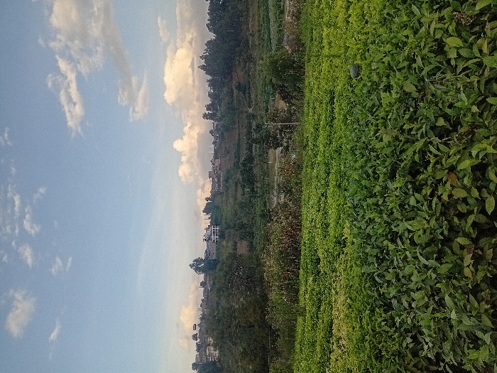 A lush green field dominates the right side of the image. Beyond it, a line of trees and houses is visible against the sky, which is blue with scattered white clouds. The scene suggests a rural or suburban landscape with a blend of cultivated land, natural vegetation, and residential areas. The overall impression is one of openness and natural beauty.