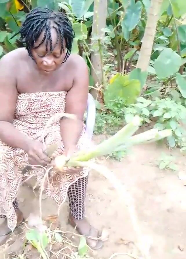 A woman sits on a purple plastic chair in a partially shady outdoor environment, facing the camera. She is cutting the roots off of a leafy green plant. She wears her hair in tight braids and is dressed in a strapless, patterned dress over patterned pants. The ground around her is dirt and covered in dried leaves and stems. Behind her there are several leafy green plants.