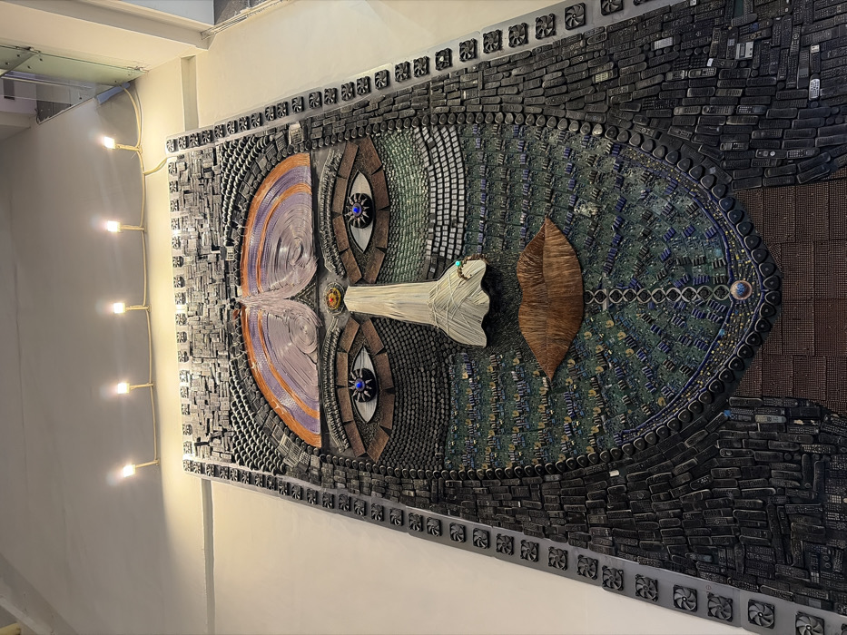 A large, vertically oriented mixed-media artwork, depicting a stylized human face, is mounted on a light-colored interior wall. The artwork is constructed predominantly from discarded electronic components. The forehead area features layered, coiled material in shades of purple and orange. The eyes consist of dark, spherical pupils with lighter, radial irises, set within orbital and cheek areas composed of fragments of green and blue circuit boards populated with capacitors and microchips. A three-dimensional nose, made of wrapped white material, includes a small green electronic component near the right nostril. The lips are a distinct, reddish-brown, textured form. The perimeter of the artwork, framing the face, is composed of numerous black remote controls and small computer cooling fans integrated along the vertical edges. A central vertical element below the mouth resembles a double helix structure, terminating in a spherical, iridescent bead. Five individual wall-mounted light fixtures with exposed bulbs illuminate the top of the artwork. No people are present. This scene is located in Bengaluru, India.