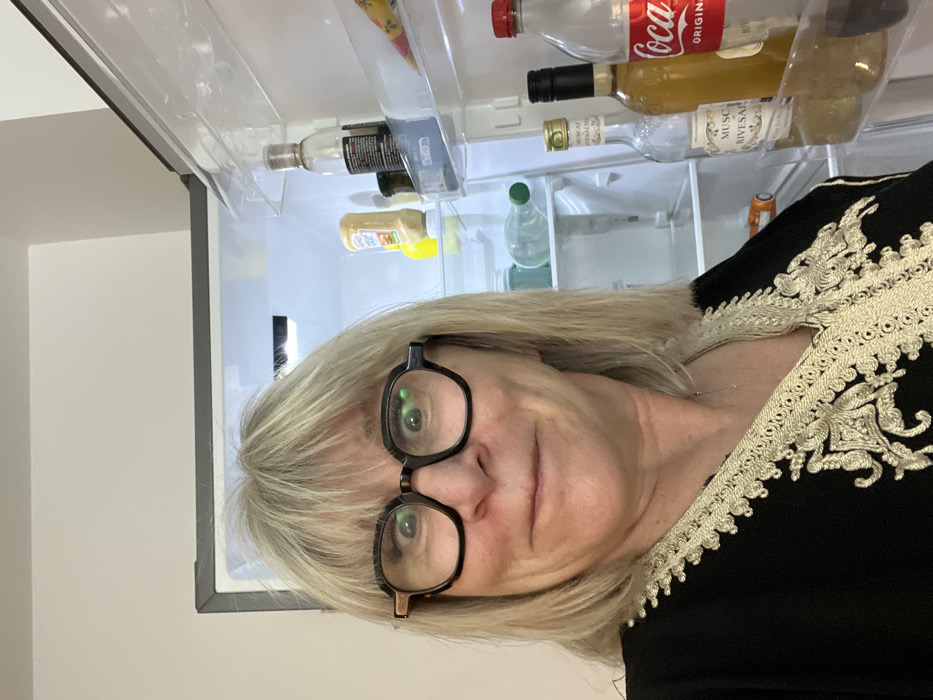- "A woman wearing glasses and a black dress with ornate gold trim stands in front of an open refrigerator" by FM-vTiXm2, licensed under CC BY 4.0