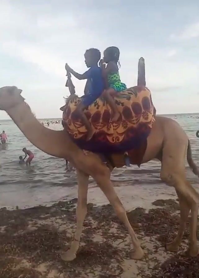 A video shows two children riding a camel on a beach. The children, a boy and a girl, sit on a colorful blanket placed on the camel's back. The boy wears a blue shirt, while the girl wears a green and blue dress. The camel is tan and walking on the sand near the water. There are other people in the background, some in the water. The sky is overcast. The beach is covered with seaweed.