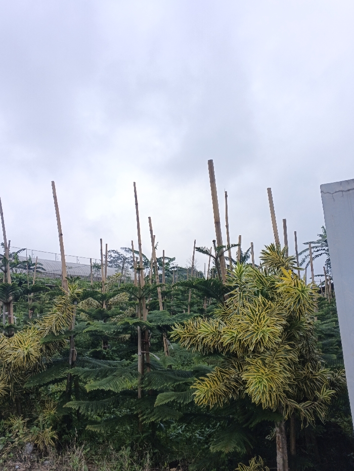 A field of young evergreen trees supported by bamboo poles stretches towards the horizon under a cloudy sky. The trees are primarily dark green, with one in the foreground exhibiting vibrant yellow and green variegated foliage. A partial white structure is visible to the right edge of the frame, adding an architectural element to the natural setting. A greenhouse structure is visible in the background.