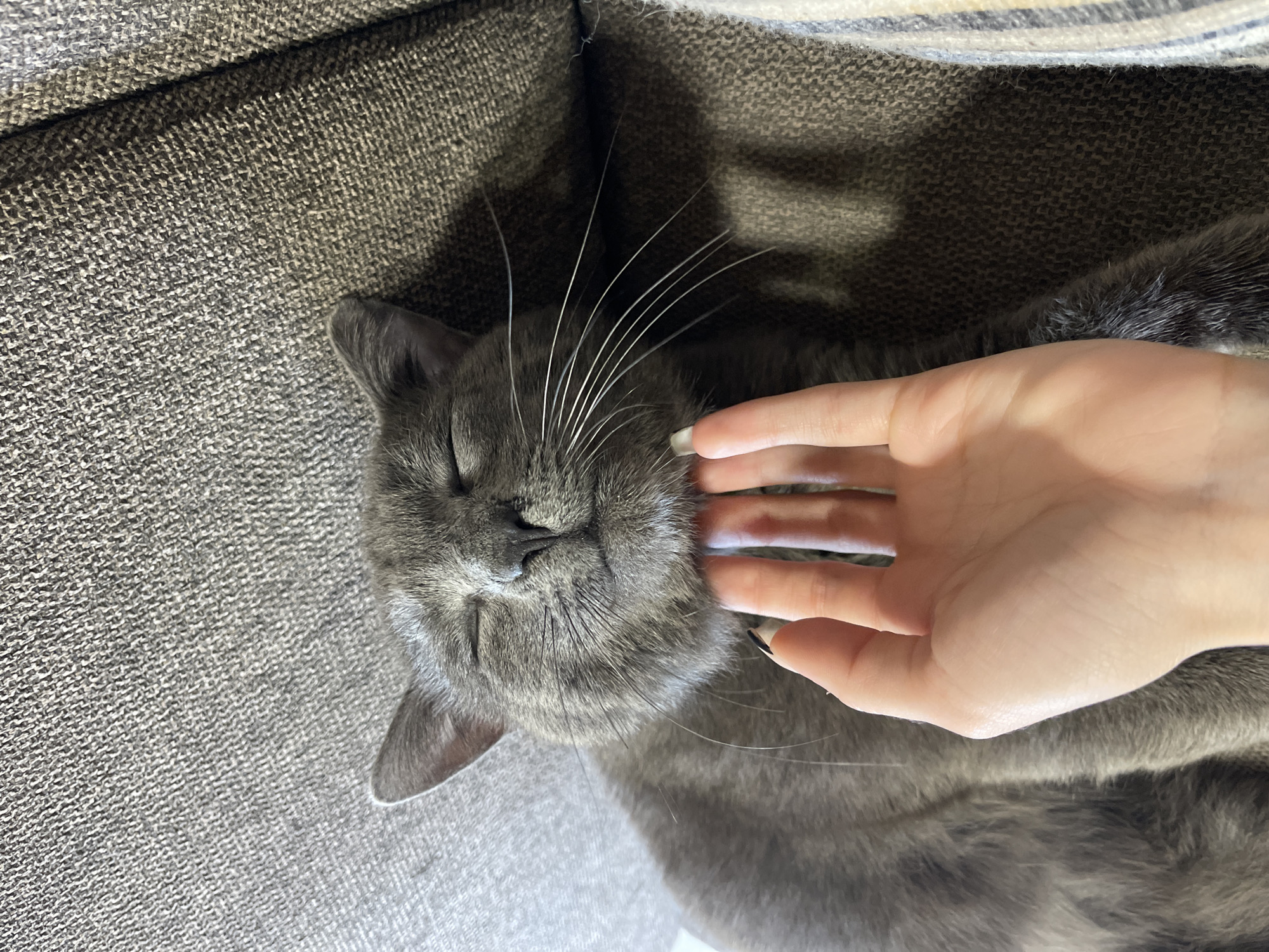 - "A grey cat lies on a brown textured surface, likely a sofa or bed, with a human hand gently touching its face" by FM-tcinL2, licensed under CC BY 4.0