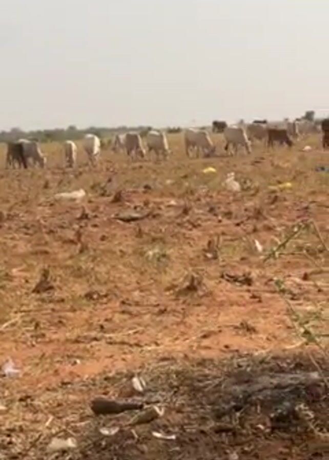 herd of cattle grazing in a field. The field is dry and sparsely vegetated, with patches of bare earth and some scattered debris. The cattle are mostly light-colored, with a few darker ones mixed in. They are spread out across the field, and most are grazing with their heads down. The sky is light and clear. The camera appears to be stationary and on the ground.