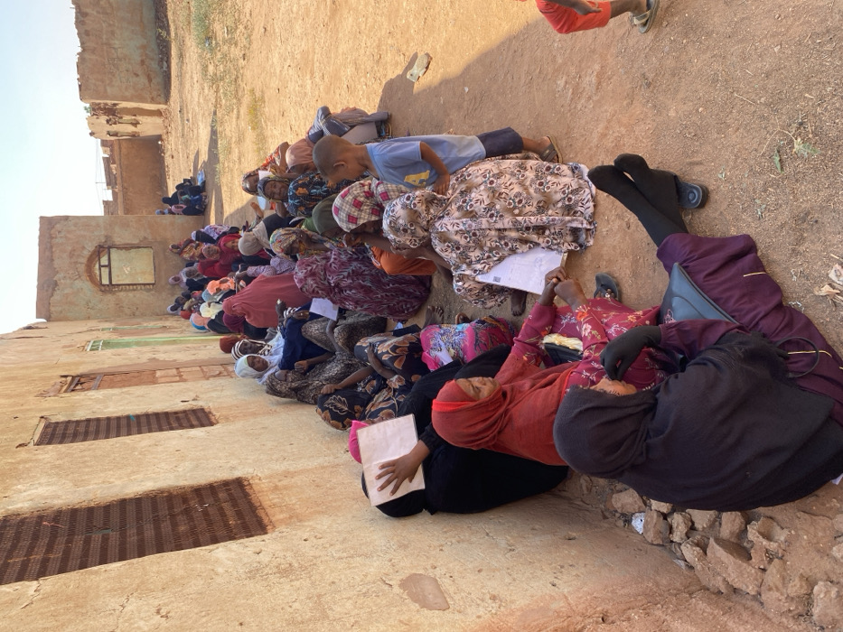 - "A large group of individuals, predominantly women and children, are depicted sitting on the reddish-brown dirt ground, forming an extended queue along the side of a worn, light brown building in Omdurman, Sudan" by FM-FIrXA2, licensed under CC BY 4.0