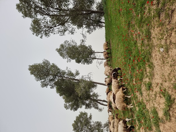 The scene is an open field on a moderate incline in the Lachish Regional Council, Israel. Approximately 20 to 30 sheep with light-colored fleece, interspersed with some darker wool patches, are dispersed across the green grassy slope in the mid-ground and background, actively grazing. Numerous small, bright red flowers are visible among the green grass. Several tall coniferous trees with dark green foliage stand upright on the hillside, extending into the upper portion of the frame. The foreground features exposed light brown soil mixed with sparse green vegetation. The sky is uniformly overcast and light grey. No human figures or man-made structures are present.
