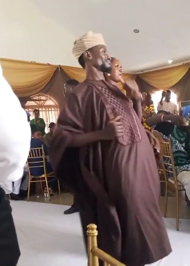 man in a brown traditional Nigerian Agbada walking along a white runway in a well-lit indoor venue. He is wearing a cream-colored fila (traditional cap). He moves in a rhythmic fashion, seemingly to music, with a woman following behind him. The venue appears to be set up for a celebration or event, with tables occupied by seated guests. There are people in the background taking pictures and video, and the walls are draped with golden fabric. A person wearing a black suit and white shirt stands on the left of the frame.