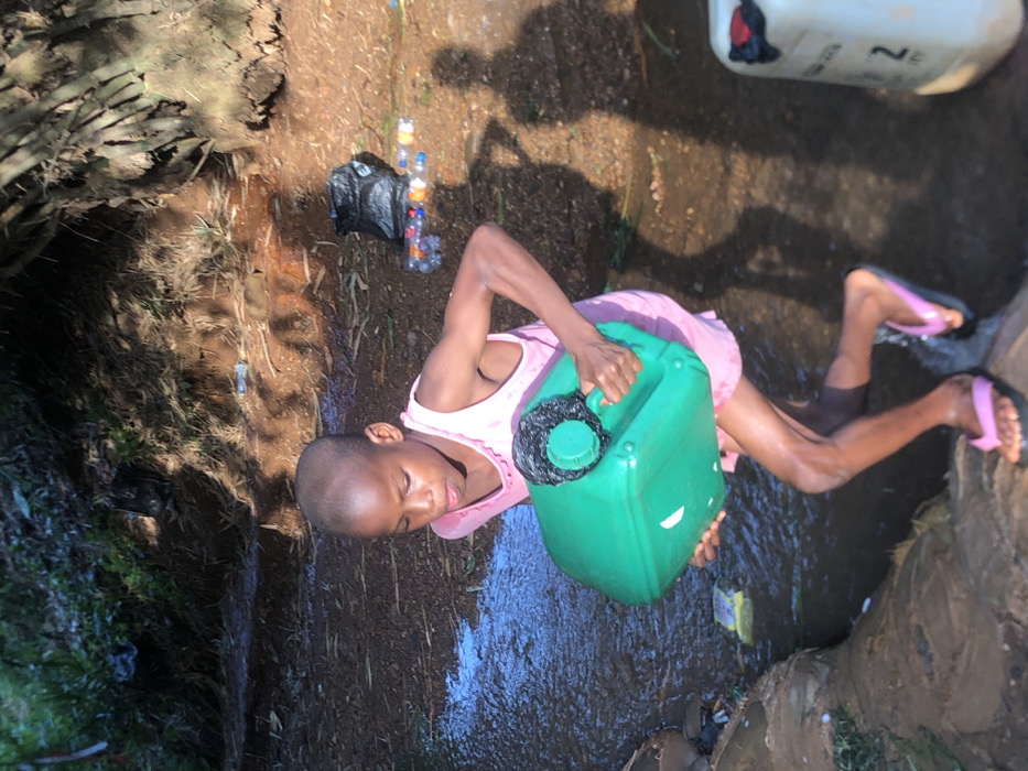 A young, bald child, wearing a light pink sleeveless dress and black flip-flops with pink straps, is depicted stepping through a shallow, muddy stream