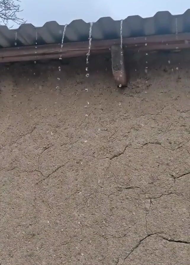 rain dripping from the edge of a corrugated metal roof. The water falls in separate streams onto a rough, cracked wall below. A bare tree branch is visible in the upper left corner against a cloudy sky.