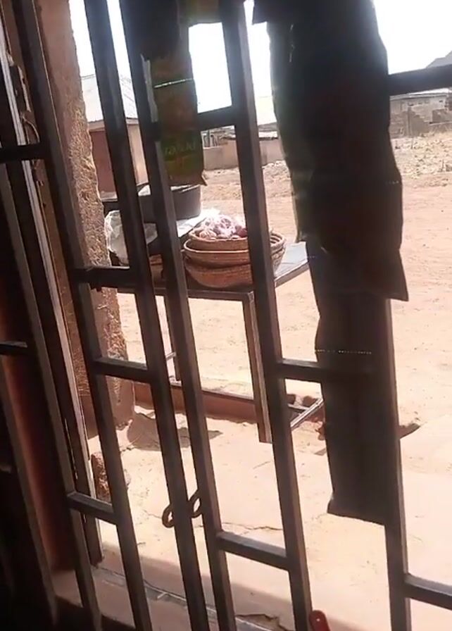 n interior view through a barred window. Outside, there's a small table with a woven basket on it, containing what looks like raw meat. Clothes or fabric are hanging on the bars of the window, partially obstructing the view. The outdoor area appears to be a dirt yard with some vegetation in the background, with glimpses of buildings in the distance. The lighting is bright outdoors, but the interior is dim. There are also household items visible in the lower corner of the interior.