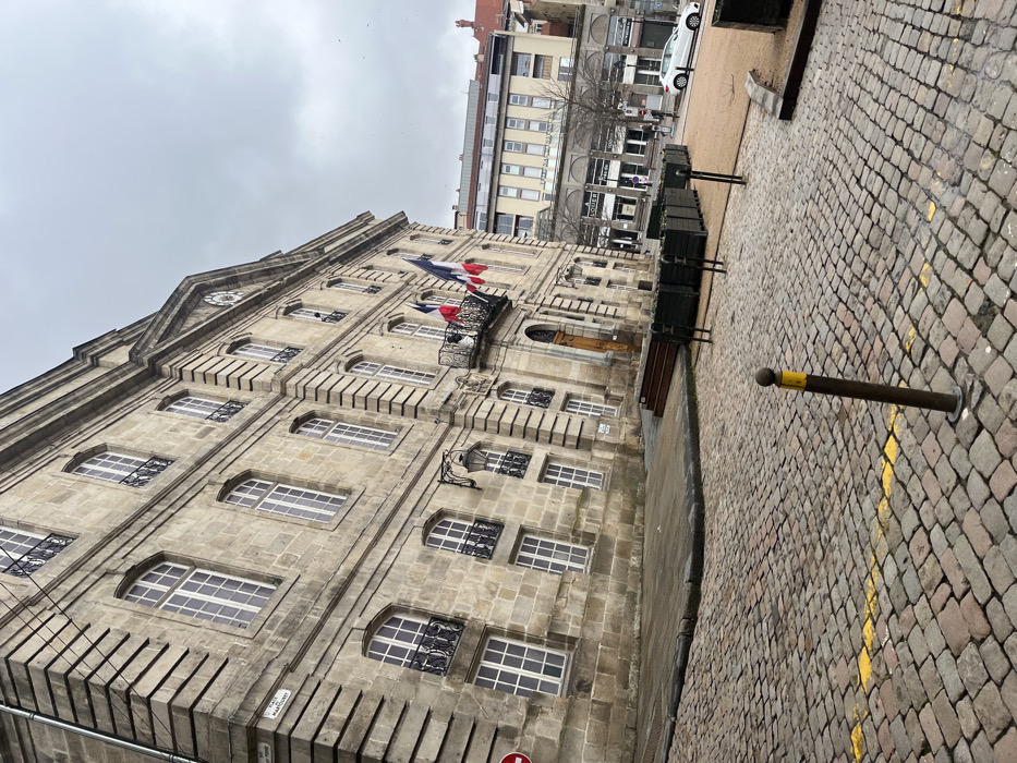 The image captures an exterior view of the Hôtel de Ville (City Hall) situated on Place Marouret in Le Puy-en-Velay, France, under an overcast sky