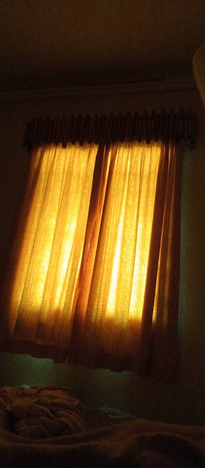 A dimly lit room reveals a window covered by thick, golden-yellow curtains