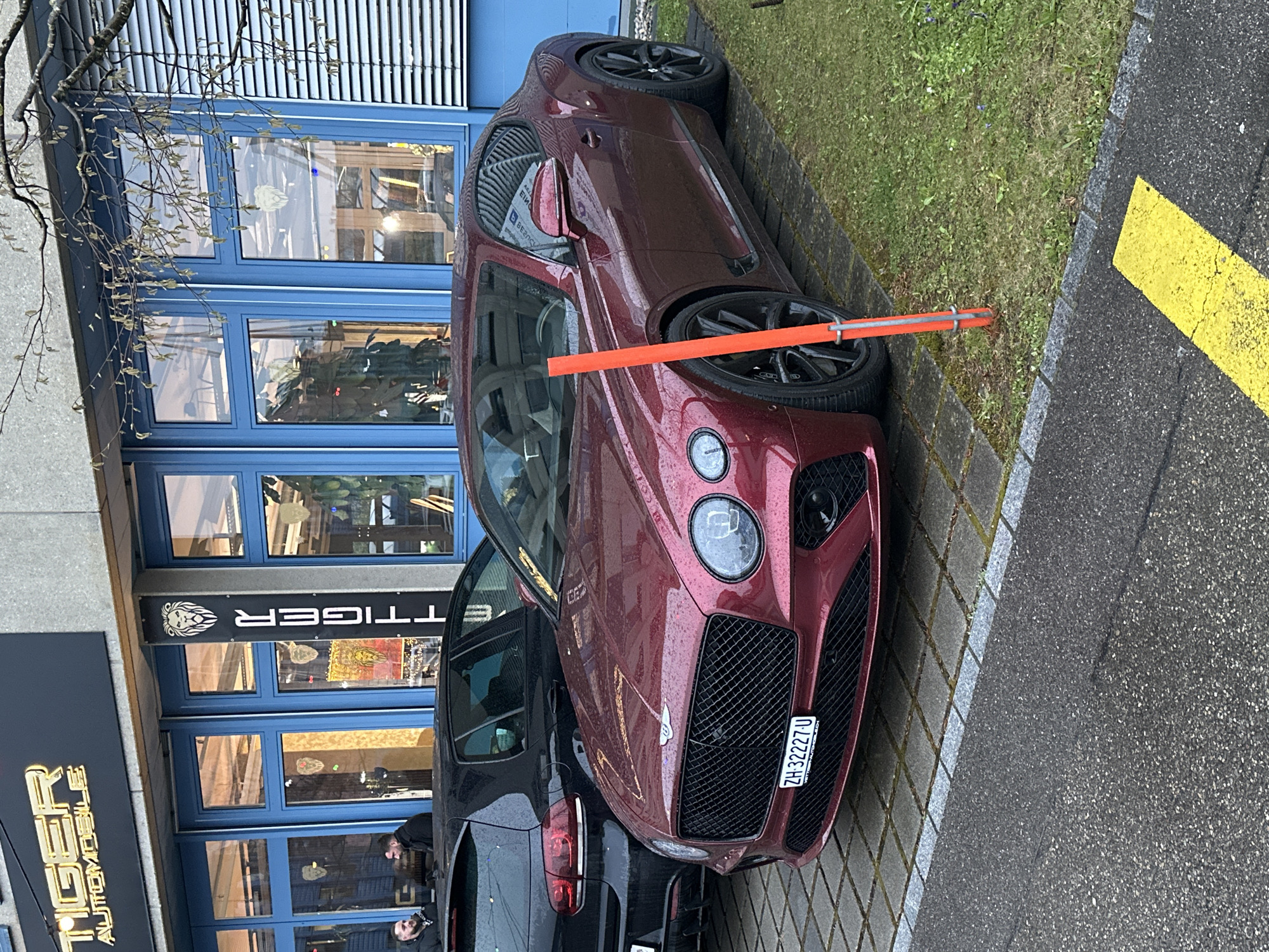 The image captures a street scene in Wetzikon (ZH), Switzerland. A burgundy Bentley Continental GT is parked on a paved area near a building identified by the "TTIGER AUTOMOBILE" signage. The Bentley's license plate reads "ZH 32227U". Adjacent to the Bentley is a black hatchback. A safety barrier is in front of the Bentley's front wheel. Reflections of people are visible in the windows of the "TTIGER" building, with two men wearing dark attire partially visible beside the hatchback. A strip of grass is on the edge of the paved area, next to asphalt pavement with a yellow line. A tree branch is visible on the left side of the frame. The weather appears to be wet.