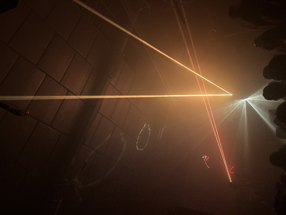 A smoky indoor space illuminated with laser beams forms a prominent triangle. A white spotlight cuts through the haze near a dark mass of what appears to be a crowd. The walls are structured in rectangular patterns. Faint, blurry shapes resembling hanging objects or reflections are visible along the wall. The overall lighting contributes to a vibrant yet slightly eerie atmosphere.