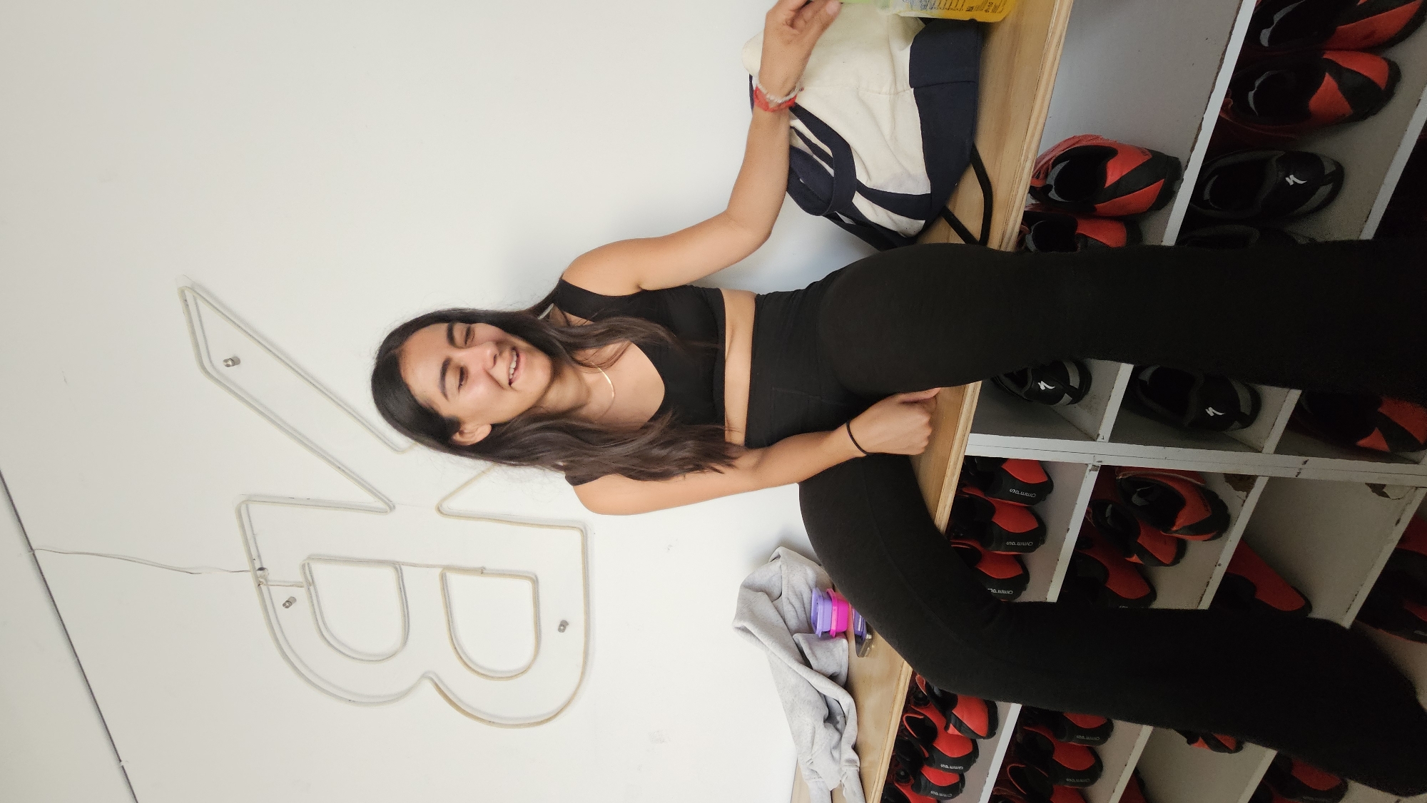 A young adult female, with long dark hair, wearing a black sports bra and black flared leggings, is seated on a light-colored wooden bench. She is smiling and looking down towards her left. A gold-colored necklace is visible around her neck, and a red bracelet is on her right wrist. To her immediate left on the bench are a folded grey sweatshirt, two small stacked plastic containers (pink and purple), and a dark-colored smartphone. To her right, a cream and navy canvas bag and a yellow plastic bottle are present. Her right hand rests near the bag. Behind her, a white wall displays a large, unlit neon sign forming the letters "BK." Below the bench, a white shelving unit is filled with numerous pairs of cycling shoes, primarily red and black, with some visibly branded "Giro" and others black with the "Specialized" logo. The scene depicts a casual moment in what appears to be a cycling or spin studio, located in the city of Puebla, Mexico.