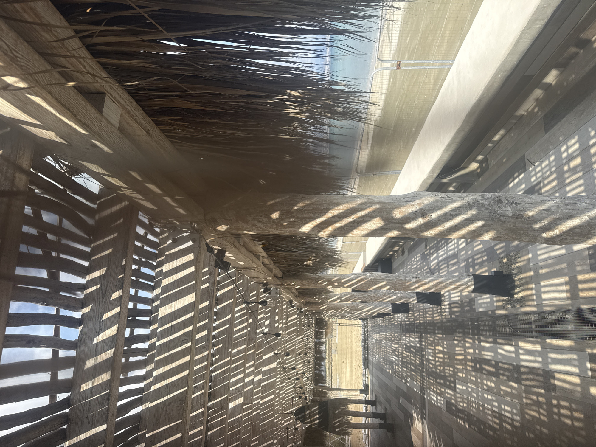The scene depicts an empty, shaded outdoor walkway under a wooden pergola, situated in Unknown, Sovereign Base Areas of Akrotiri and Dhekelia. Prominent parallel striped shadows from the overhead wooden beams are cast across the multi-toned composite deck flooring. The pergola's roof consists of a lattice of wooden slats, with sections, particularly on the right side, incorporating dried palm fronds for additional shading. Multiple thick, light-colored columnar supports with dark bases anchor the structure. A string of clear bulb lights is strung horizontally between the beams, and a large, dark, conical-shaped woven lantern hangs from the pergola on the left. A linear metal grate runs down the center of the walkway. Along the right side, a low, wide concrete bench runs parallel to the path. Beyond this, a sandy beach is partially obscured by a temporary metal construction fence. The background reveals a calm, light blue-green sea under a clear sky. No individuals or active interactions are present.