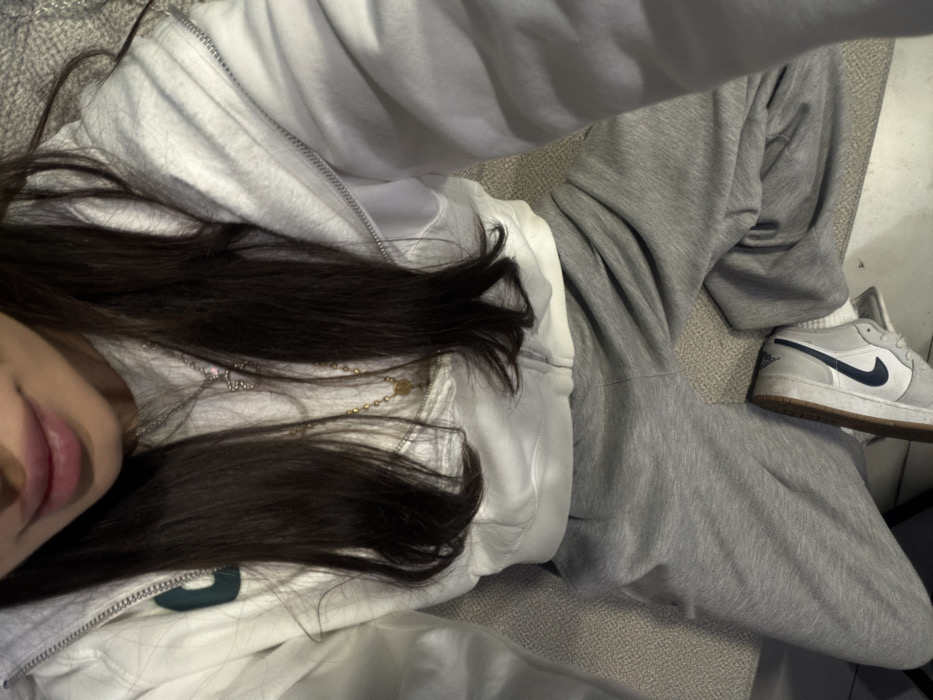 A high-angle indoor selfie captures the lower half of a person's face, including the mouth and chin, along with the upper torso, arms, and legs. The individual has long, dark hair. The subject wears a white cropped zippered hoodie over a white t-shirt with a partial green emblem visible on the left side of the chest area. Gray sweatpants, white socks, and light-colored sneakers with a dark blue Nike swoosh and a brown sole are also worn. Two necklaces are present: a silver-colored chain with a multi-pointed pendant and a gold-colored beaded chain with a small round pendant. The immediate environment includes a light-colored, textured surface, possibly fabric or carpet, on the left, and a lighter, smoother surface on the right. This scene is located indoors in Yerevan, Armenia.