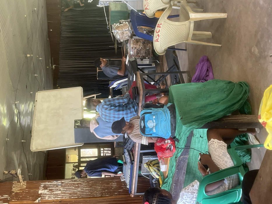 This image captures an indoor scene in Uturu, Nigeria, featuring seven individuals and various musical and sound equipment. In the foreground left, a female with braided hair and a white lace top is seated in a green plastic chair, looking downward. A green-draped table in front of her holds a blue backpack and a red pouch. Behind this table, a male in a black cap and beige t-shirt is seated. Further left, a male in a dark blue shirt stands near a sound mixing console. Behind him, two males are positioned: one in a light blue hoodie and another in a blue plaid shirt, the latter seated and operating a laptop. To the right, a male in a dark grey shirt is actively playing a drum kit, which includes a snare, tom, and cymbal. Several light beige plastic chairs with "ASCR" embossed on the backrest are arranged to the right of the drum kit. The room features a concrete floor, corrugated wooden paneling on the left wall, black curtains along the back wall, and an exposed ceiling with multiple light fixtures and a ceiling fan visible in the upper left. Windows behind the sound mixer provide natural light.
